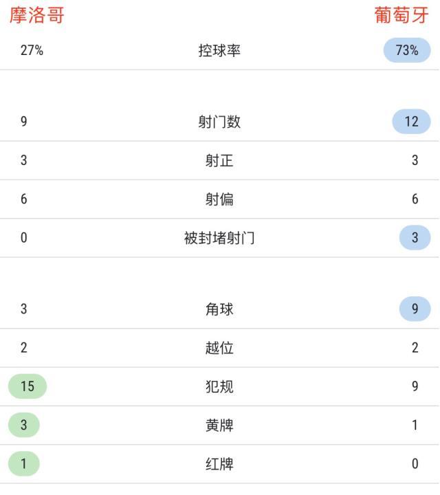 上半场葡萄牙的控球更多,但摩洛哥的射门次数反而更多。